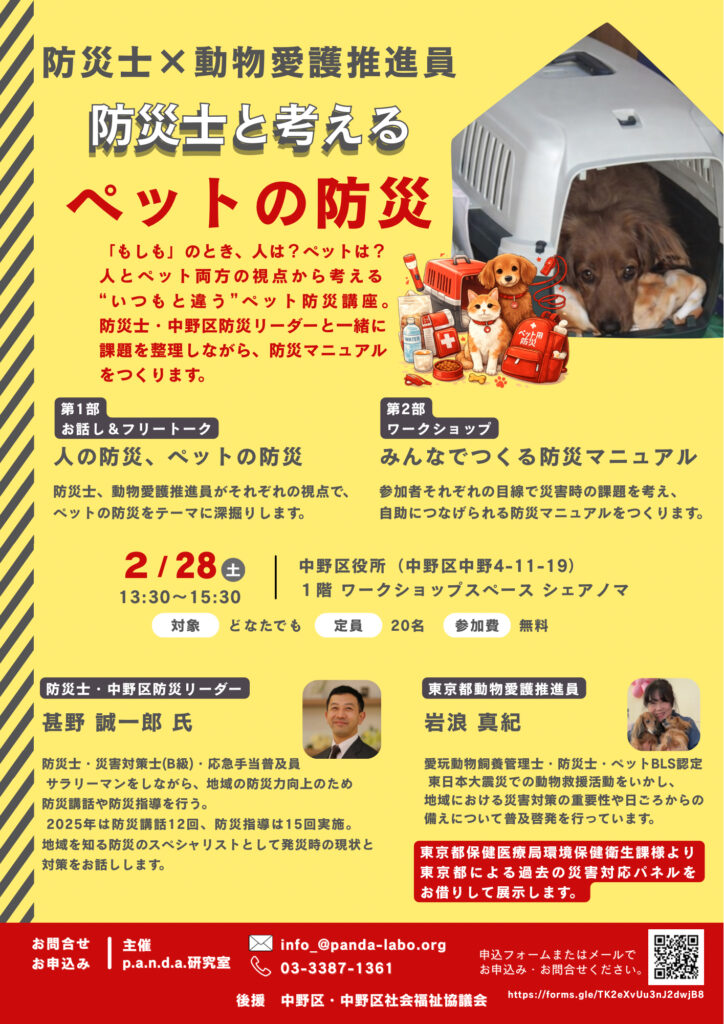 人とペット両方の視点から考える“いつもと違う”ペット防災講座。防災士・中野区防災リーダーと一緒に課題を整理しながら、防災マニュアルをつくります。