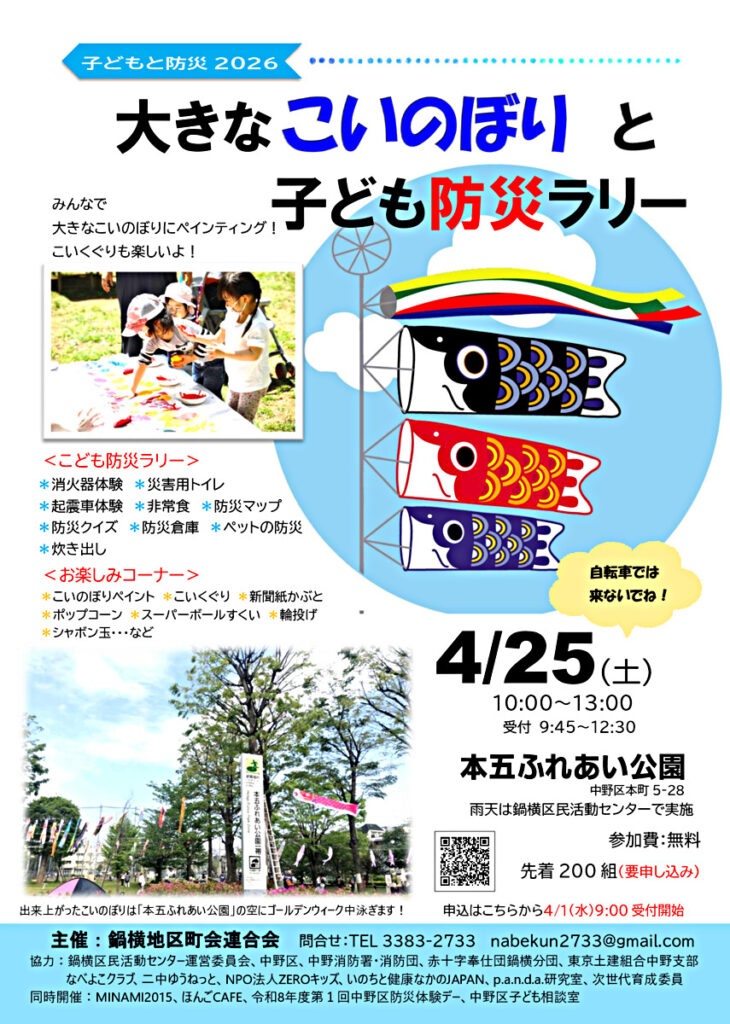 2026年4月3日 お知らせ 活動予定 子どもと防災2026 大きなこいのぼりと子ども防災ラリー 大きなこいのぼりと 子ども防災ラリーにペットの防災でブース参加します。昨年に続き、地域の方にペットとの防災をお知らせできる機会をいただきました。 4月25日(土)10:00〜13:001本五ふれあい公園(中野区本町5-28) 主催:鍋横地区町会連合会 0読み込み中... タグ: ペットペットの防災中野区犬猫防災
